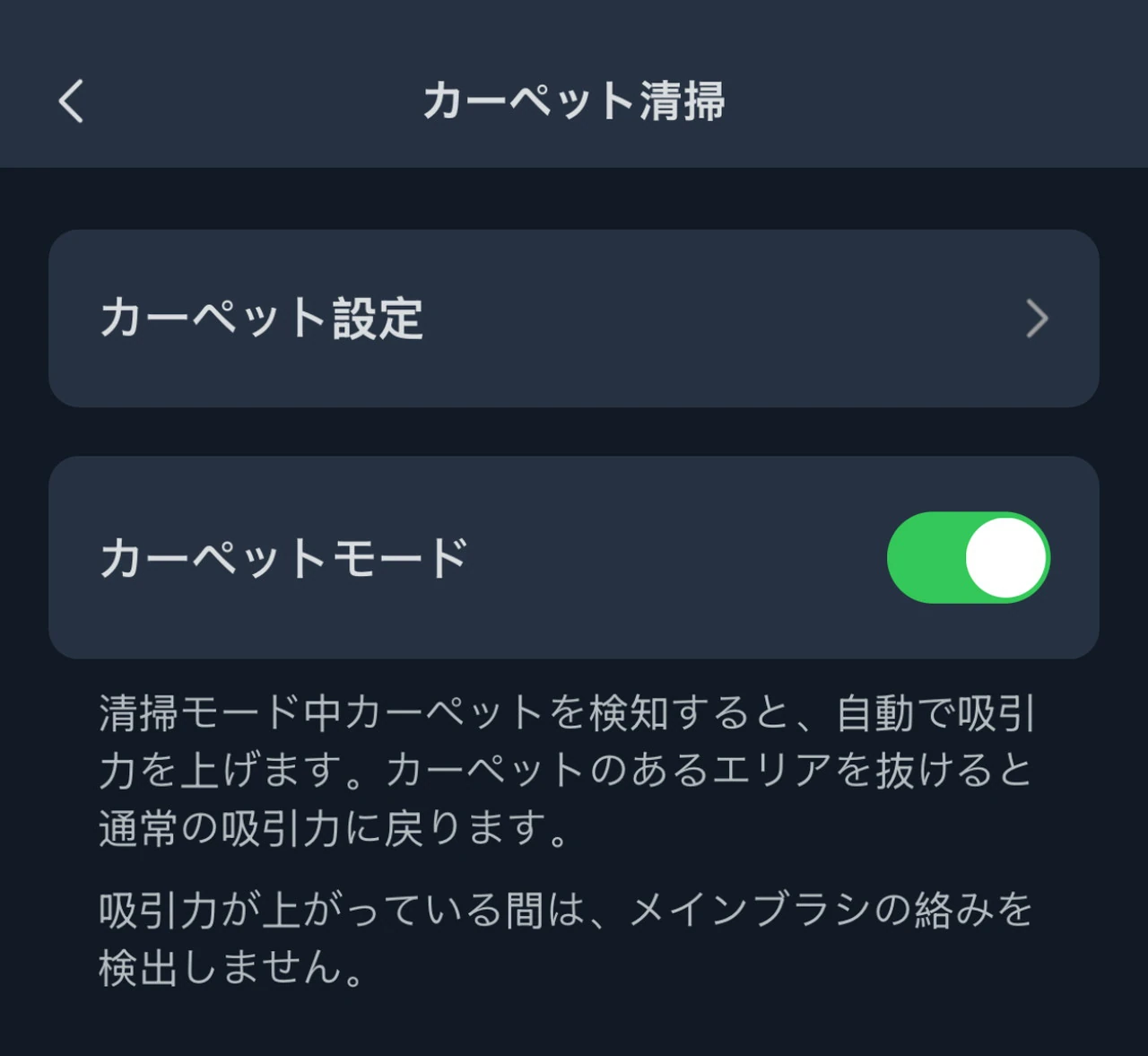 ▼アプリ上で機能のオン/オフを切り替えられる。オンにすると壁際やコーナーの掃除漏れが生じる可能性もあるため、ケースバイケースで設置すると良いだろう。