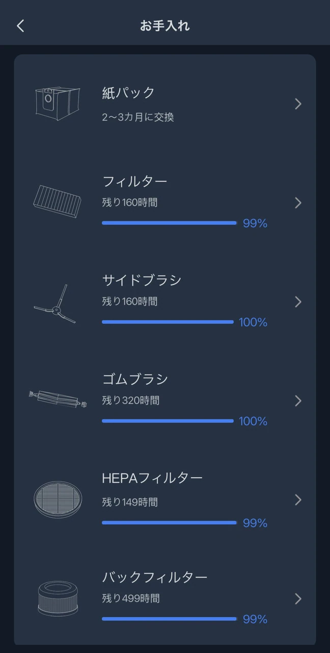 アプリ上には消耗品の使用時間が記録されており、交換までの残り目安期間を確認することができる。