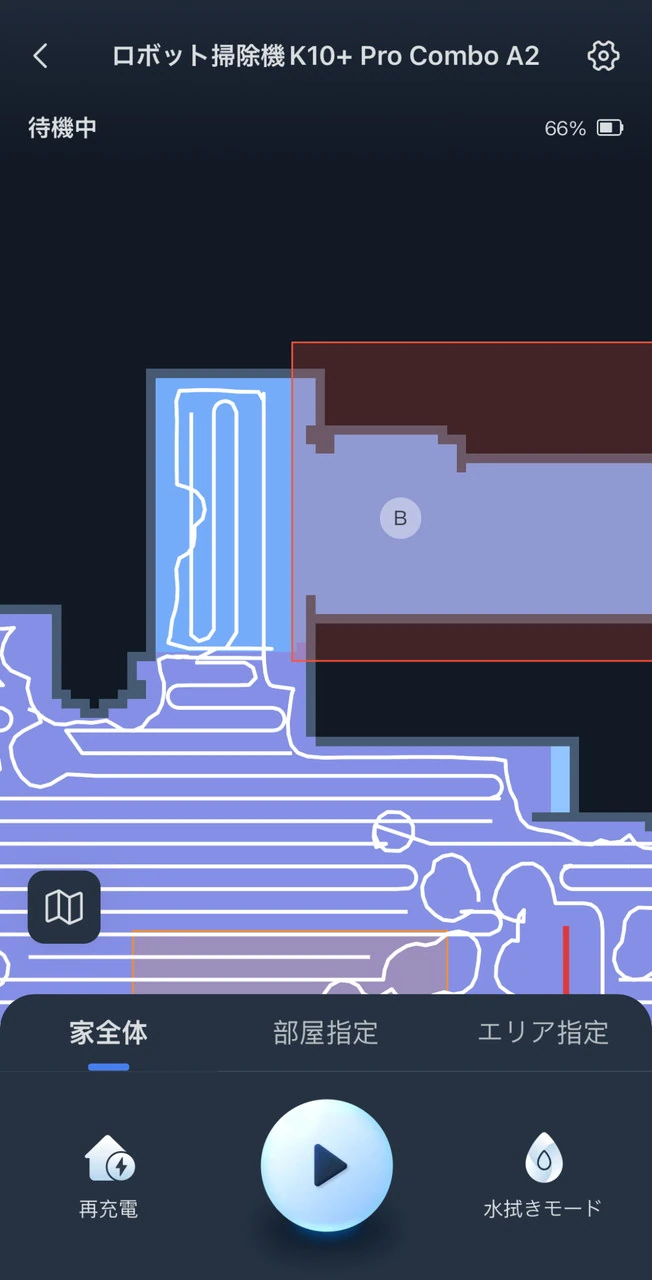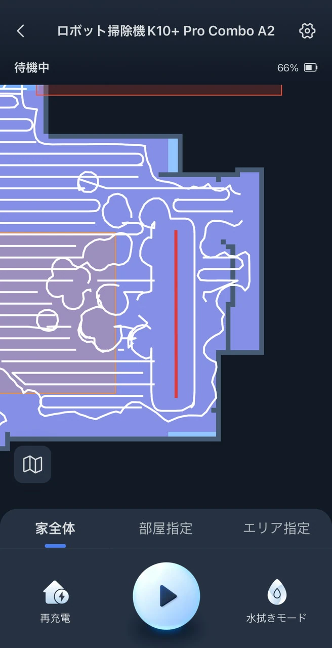 ▼実際の走行軌跡。進入禁止エリアやバーチャルウォールを避けて掃除していることが確認できる。