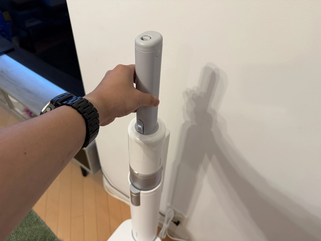 そして使い終わった後は、再度ステーションのホルダーにスティック掃除機を格納することで、充電と集塵が開始される。