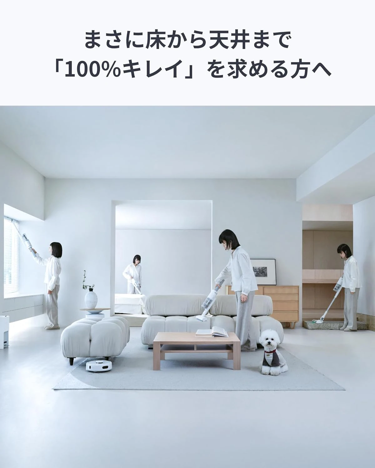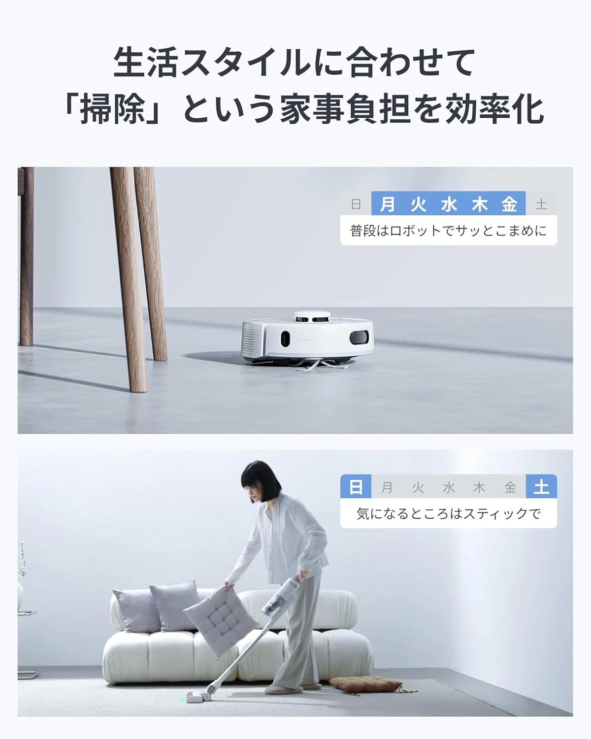 | 吸引力 | ・ロボット掃除機:最大3,000Pa ・スティック掃除機:最大20,000Pa |