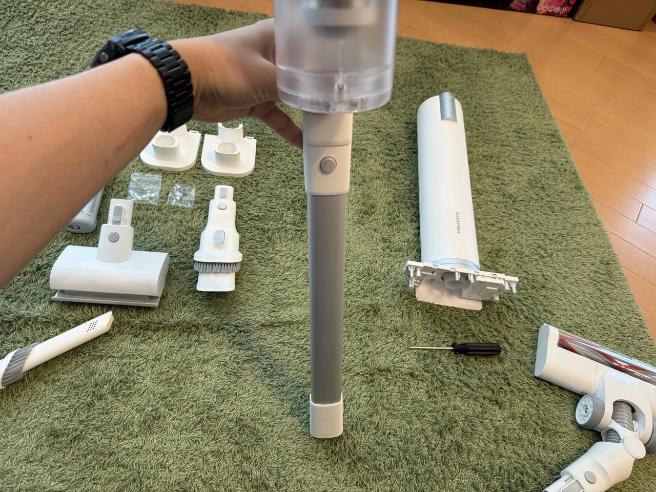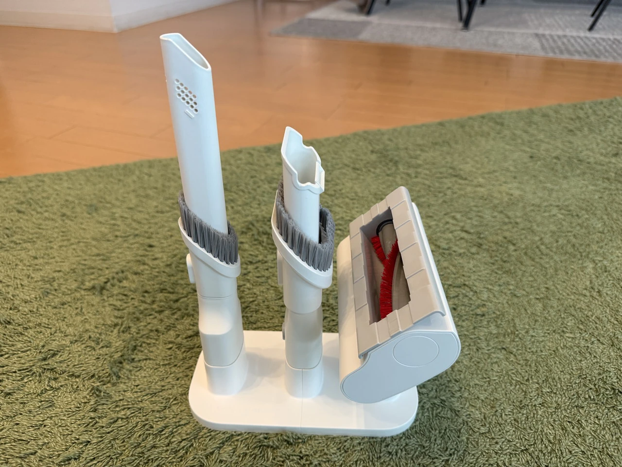 そしてスティック掃除機にはすき間ノズル、2WAYすき間ブラシ、ダニ取りブラシ、床用ノズルの4種類のパーツが付属しており、掃除する場所や目的に応じて、柔軟に使い分けることができる。
