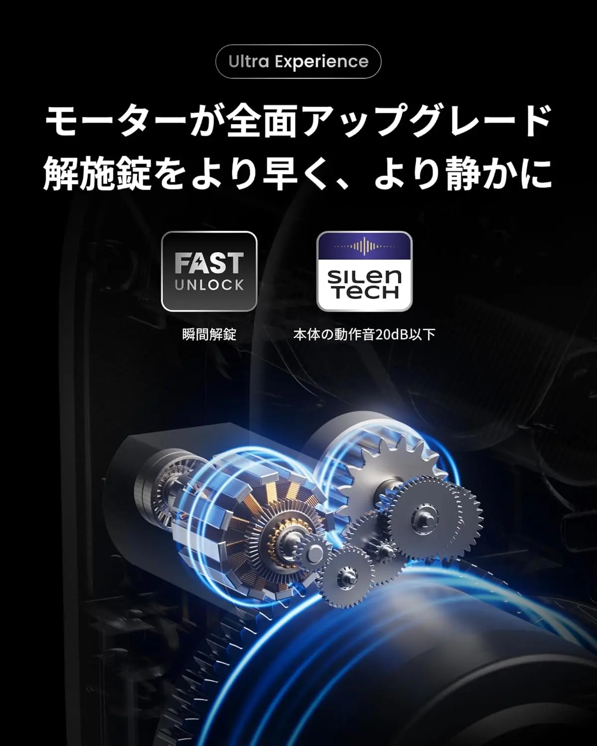 ドアの解錠速度は最速0.75秒。素早い解錠速度の一方で20dB以下の静音性も実現しており、より早く・より静かにロックを解除できる。