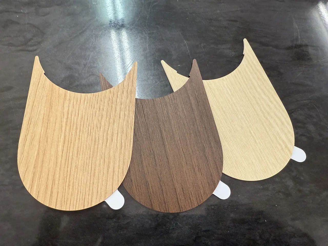▼3種類の木目調化粧シートが付属。取り付けるドアの素材に合わせて、好みのシートを貼ることができる。
