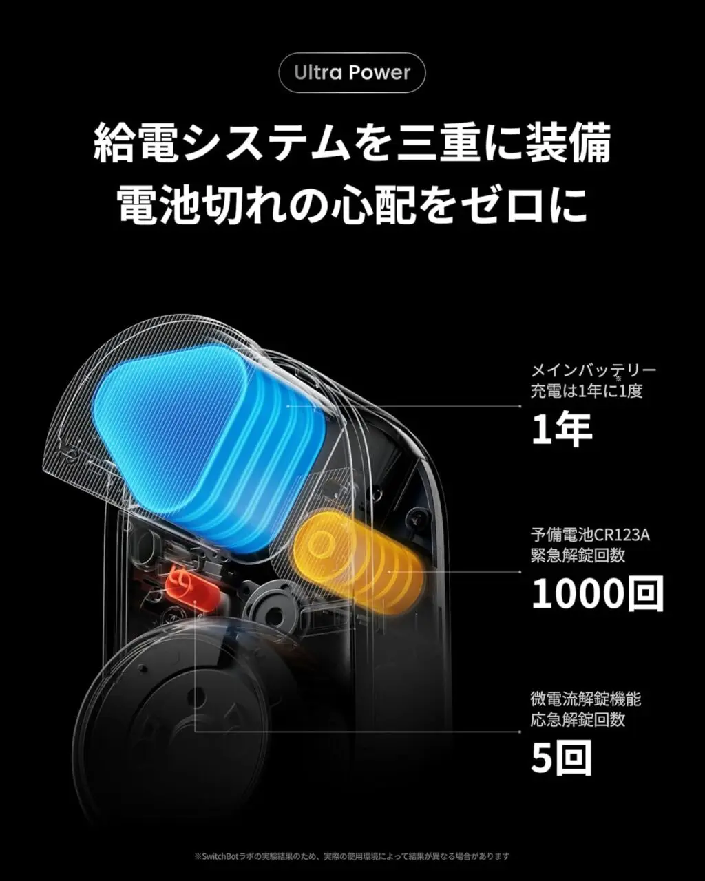 メインバッテリー + 予備バッテリー + 微電流解錠機能の3段構え