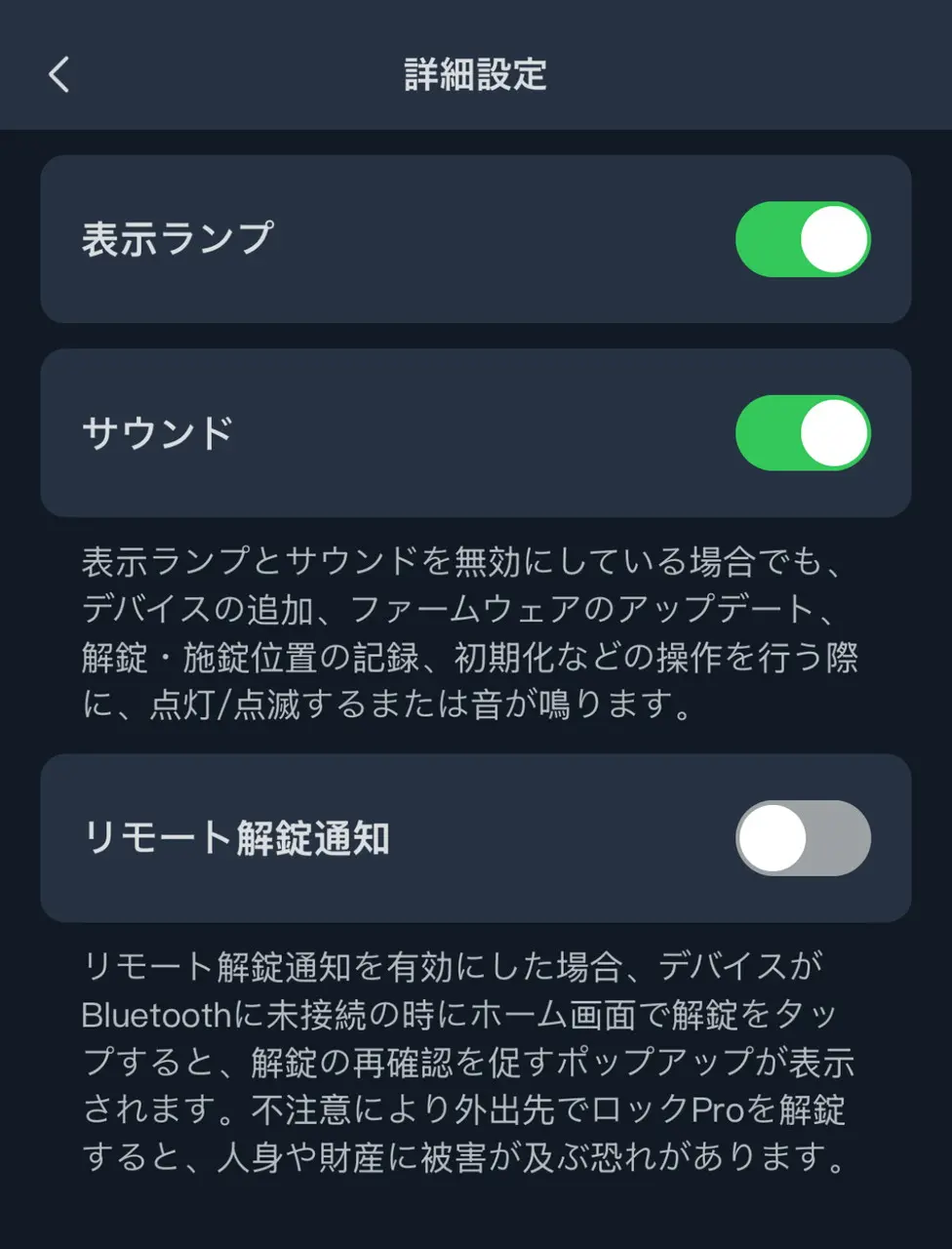 表示ランプやサウンド、リモート解錠通知のオン/オフを切り替えることができる。