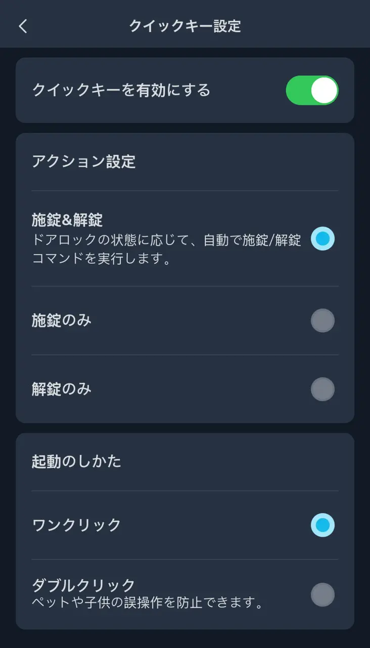 ダブルクリックを有効化することで、子供やペットが不意にドアロックUltraに触れてしまい、誤作動するのを防ぐことができる。