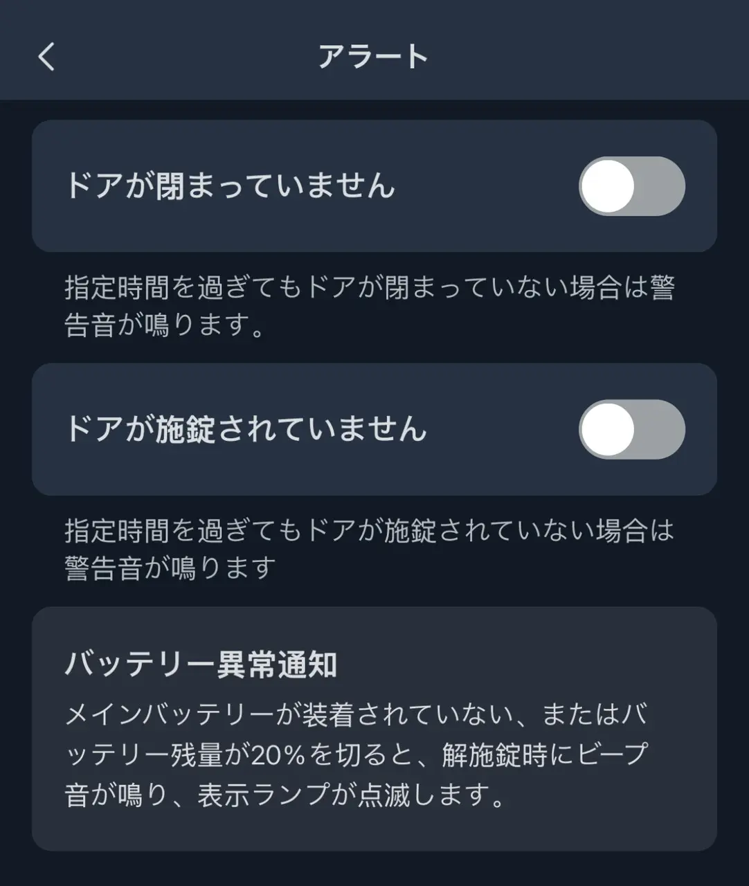 なお、解錠・施錠時の "ピー" という電子音は、後述するアプリ設定画面よりオフにできる。