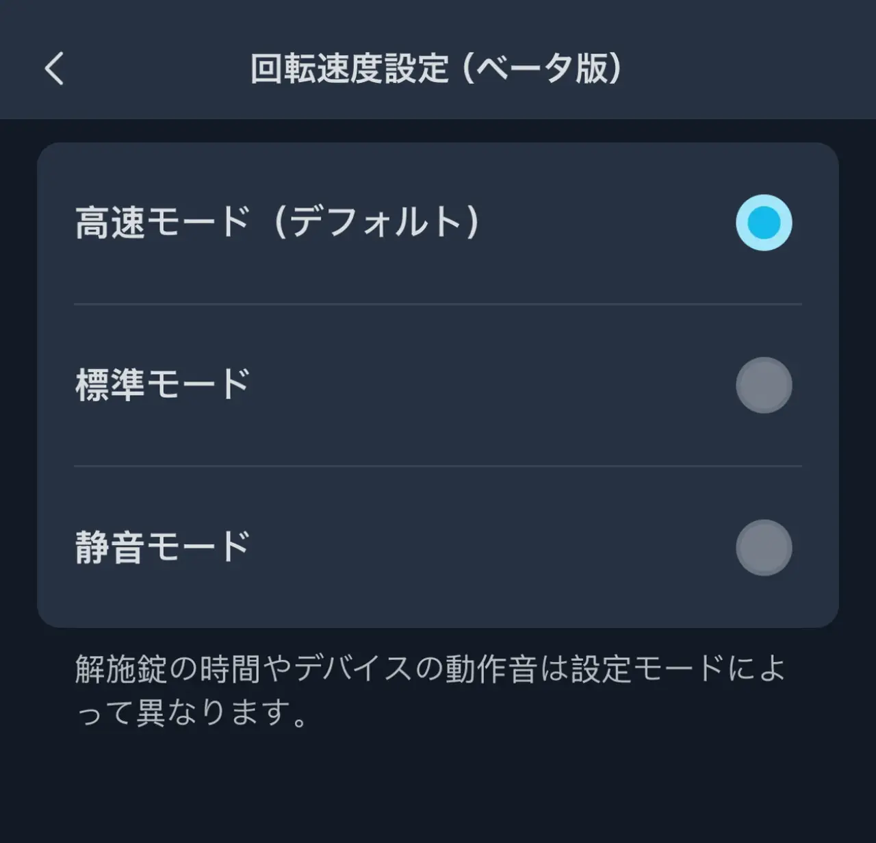 初期設定では高速モードに設定されているが、解錠・施錠時の稼働音をもっと抑えたい場合には、より低速モードに変更すると良いだろう。