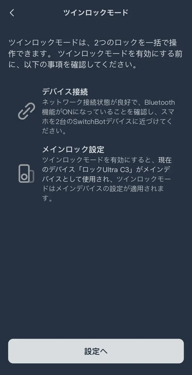 2台のドアロックUltraをアプリに接続した状態でツインロックモードをオンにすることで、2つの解錠・施錠動作を連動させることが可能となる。
