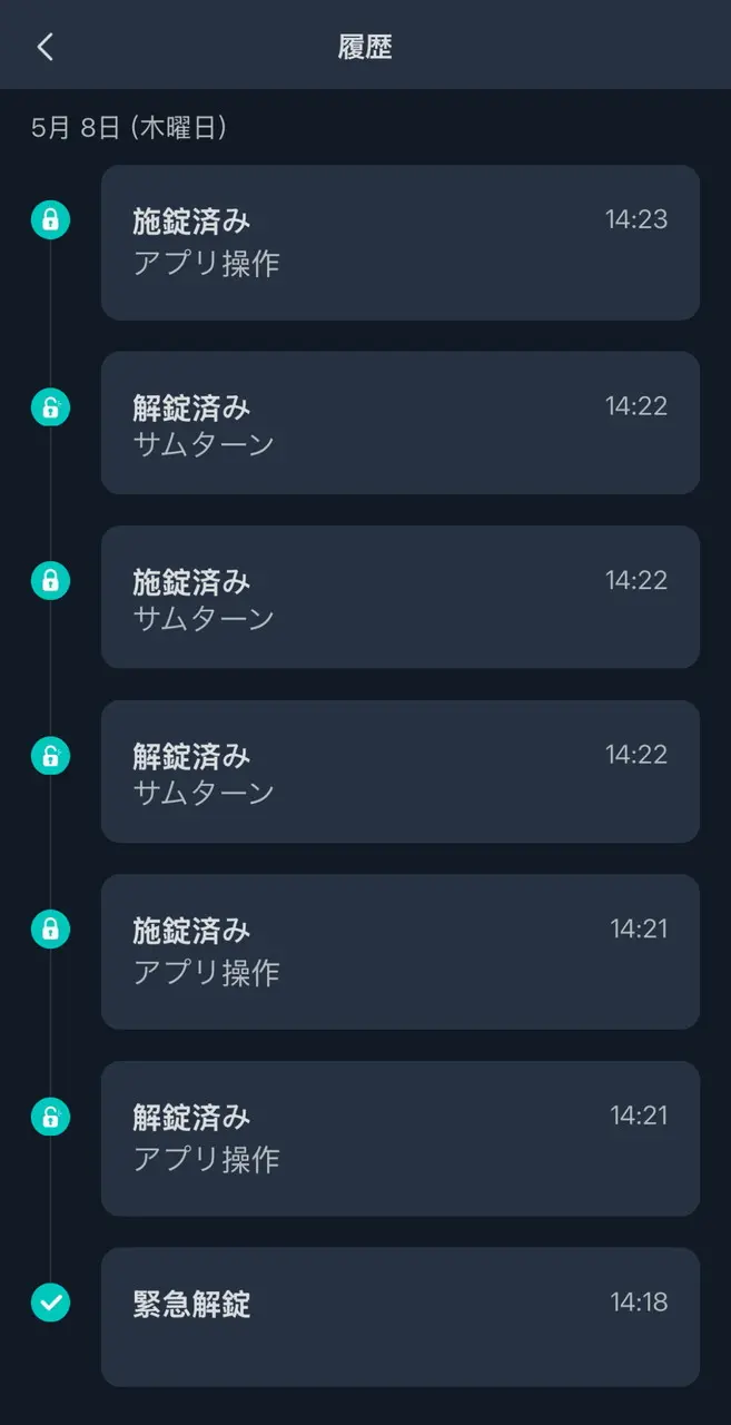 アプリから、ドアロックUltraの施錠・解錠履歴を確認することができる。