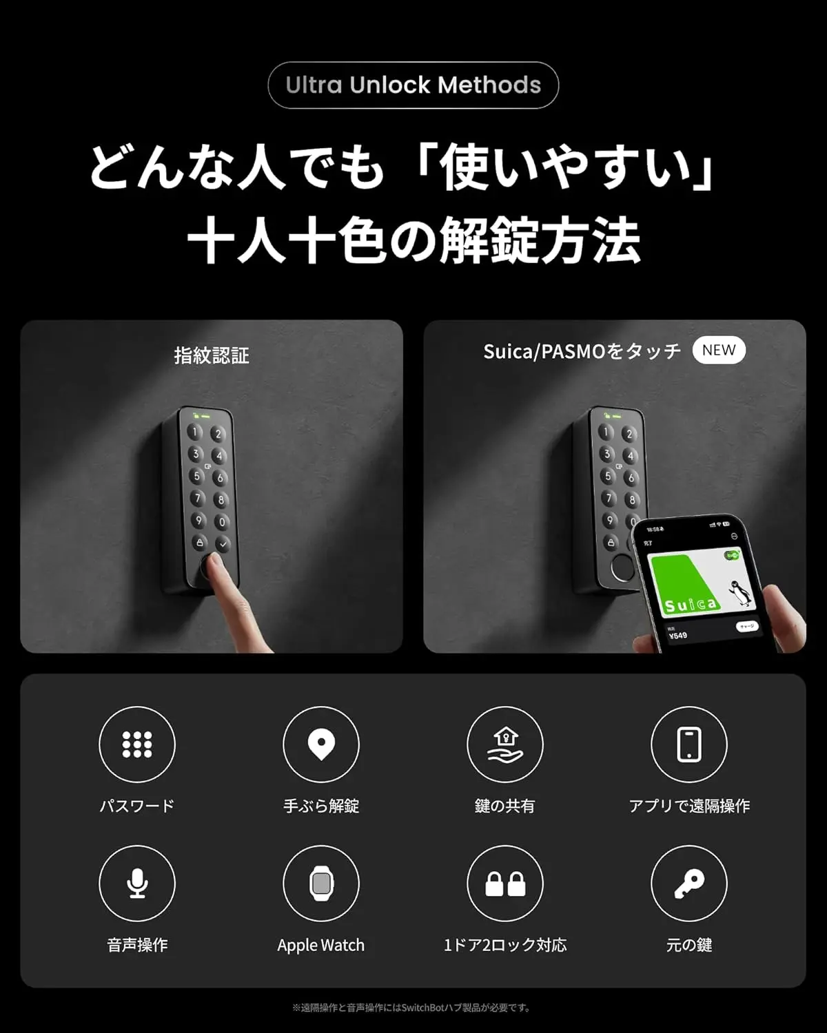 なお、別売りの顔認証パッド、もしくは指紋認証パッドを併用した場合、指紋や顔認証、NFC対応カードでのロック解除も可能となる。また、SwitchBot ハブに接続すれば、遠隔地からロックを操作したり、音声による施錠・解錠も可能となる。