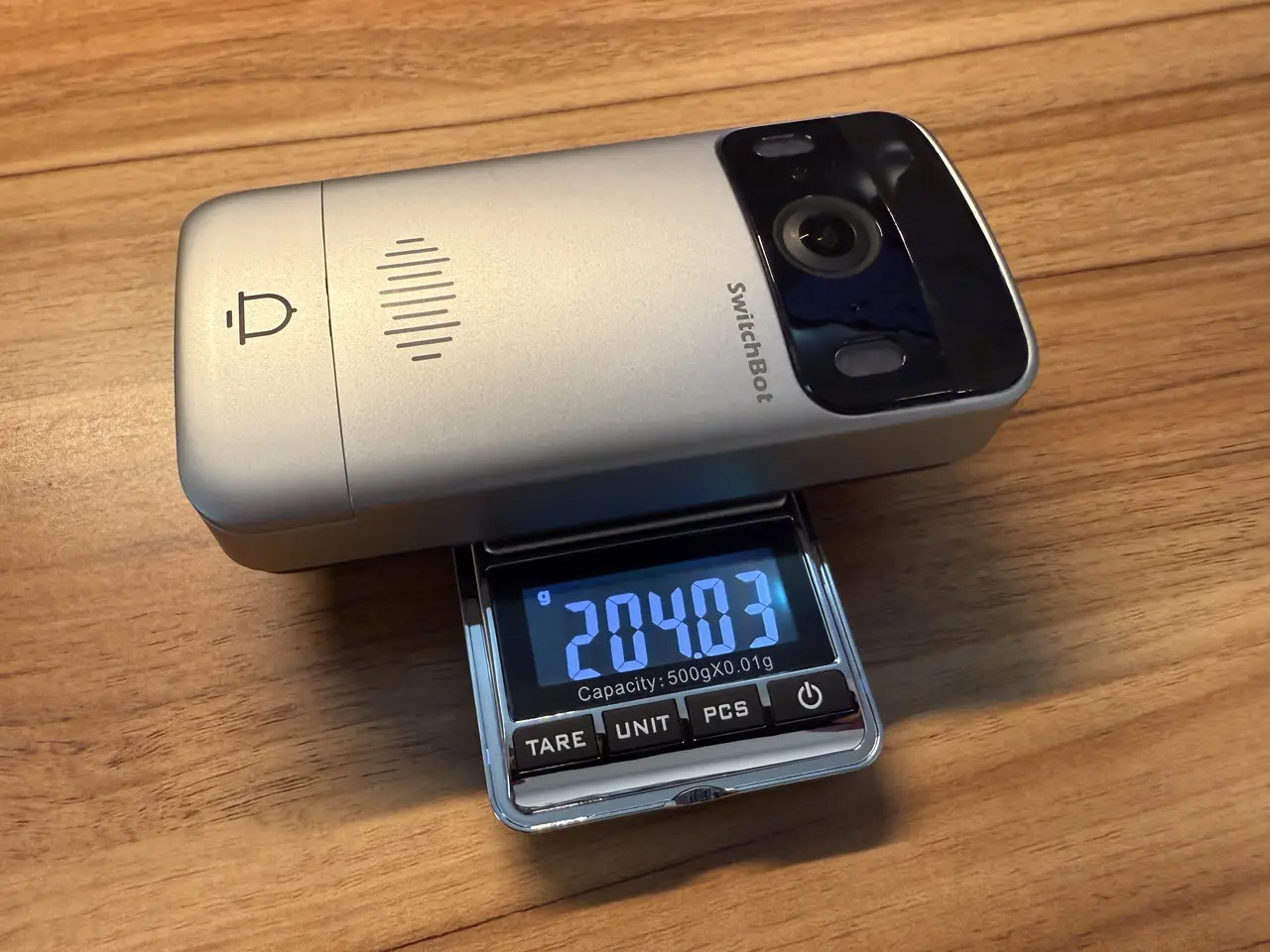 玄関子機の重量は、実測で約204gと軽量。付属の両面テープで壁面に貼り付けても、自重で脱落することはほぼありません。
