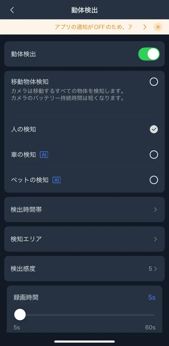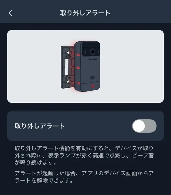 「取り外しアラート」をオンにすることで、子機が無理やり外された際に警告音を鳴らし、同時にアプリへ通知を送信できます。