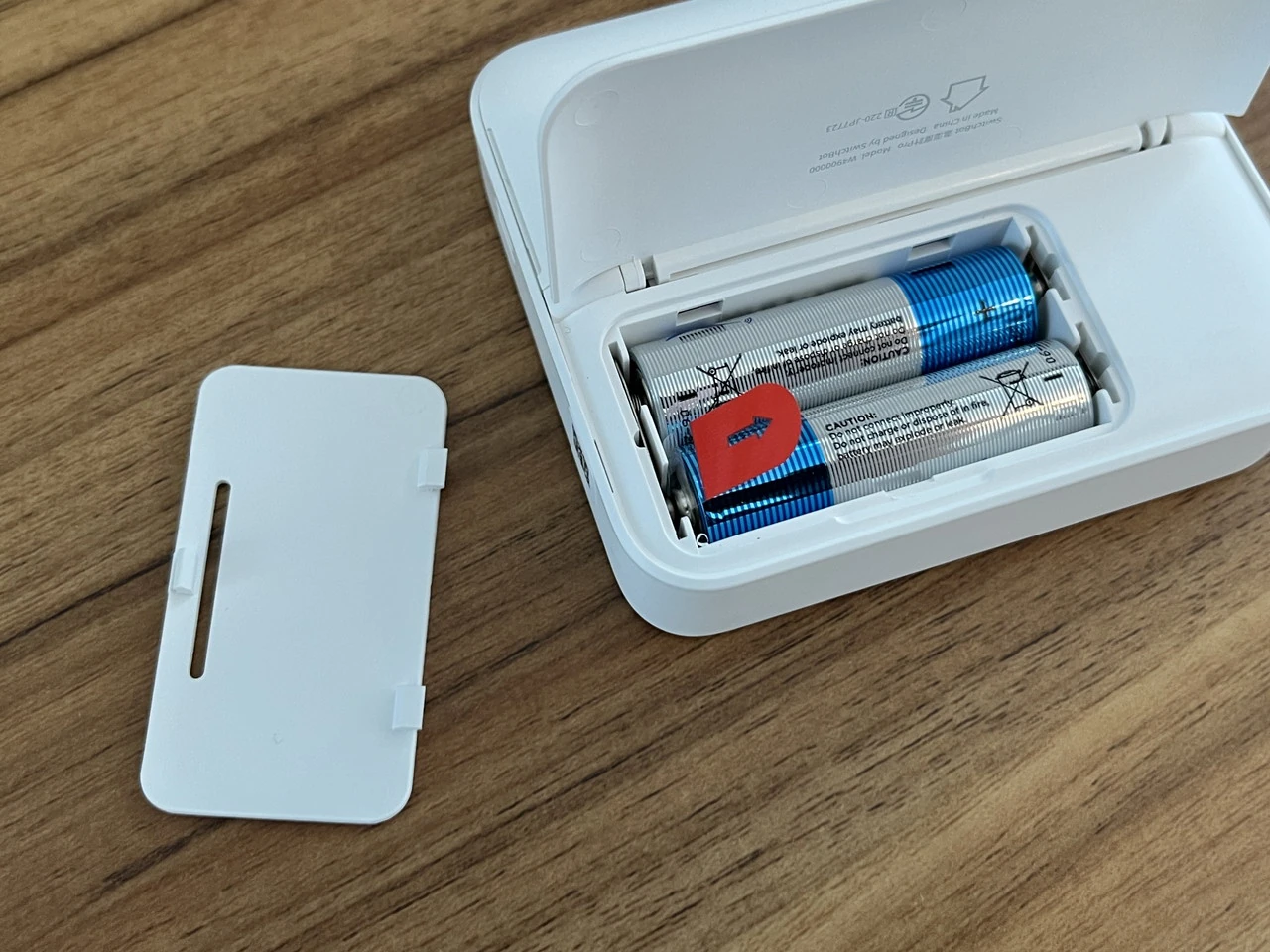 ▼さらに下のフタを取り外すと、電池投入部が現れる。購入時点ですでに単四電池×2が入っており、保護フィルムを取り外すことで温湿度計が稼働し始める。