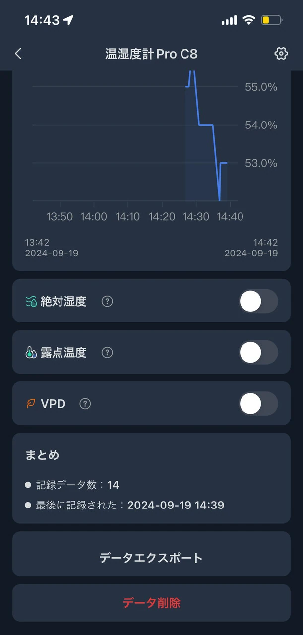 ▼アプリ連携後、計測データはアプリ上に逐一記録され、グラフ化される。データはローカルに最大68日間分、アプリに最大2年間分保存でき、CSVファイルでエクスポート(出力)することも可能だ。