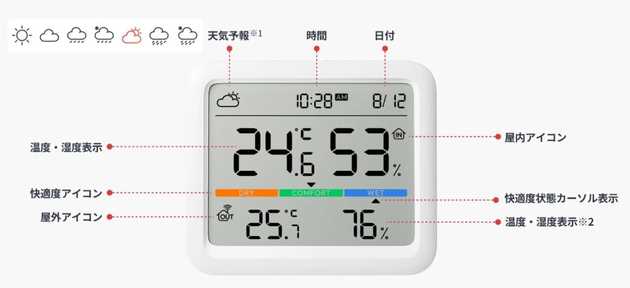▼温湿度・快適指数・天気予報・日時を一目で把握可能。