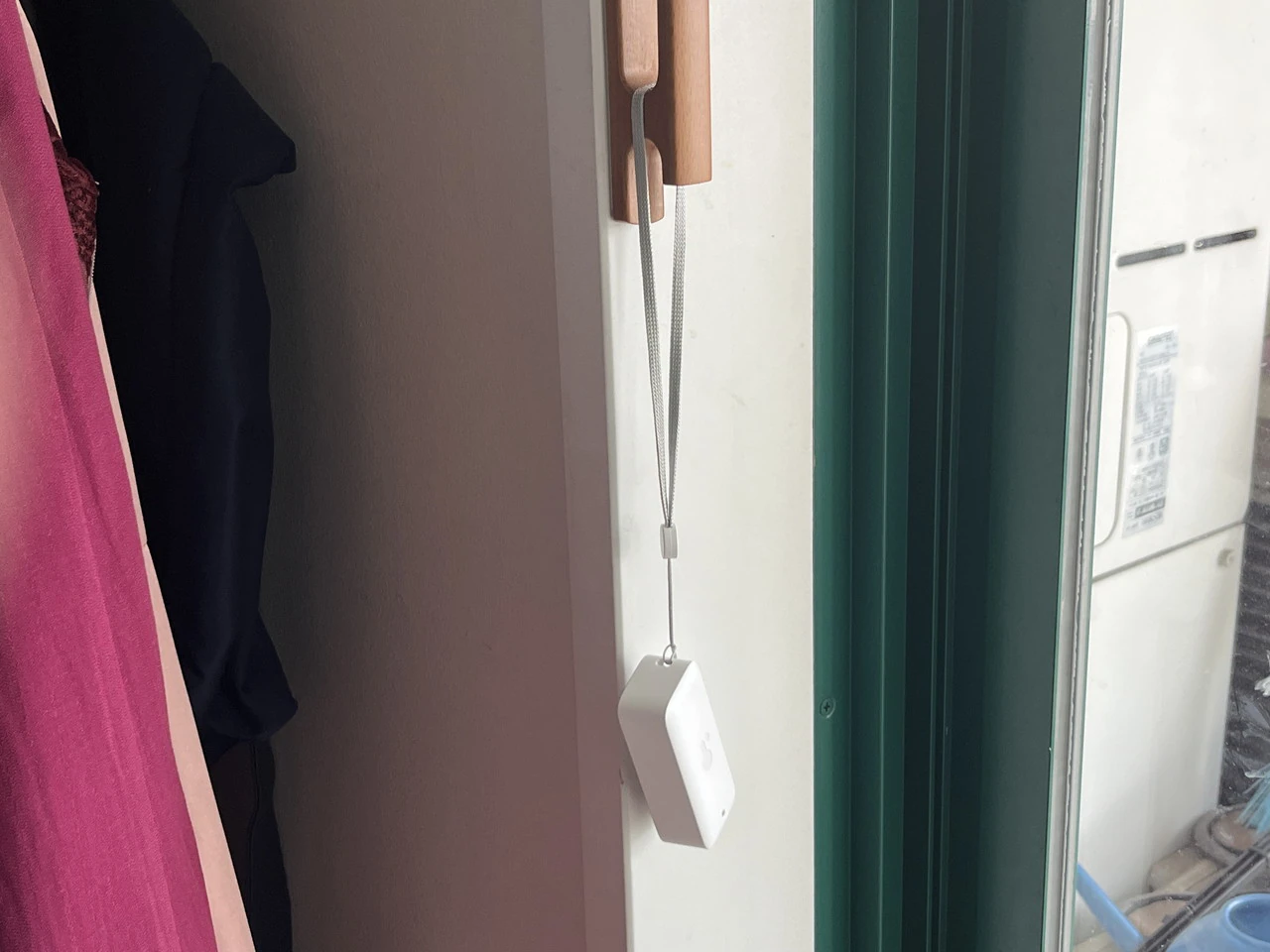 ▼パッケージにストラップが付属しているため、屋外の出っ張りに引っ掛けるなどして設置することもできる。