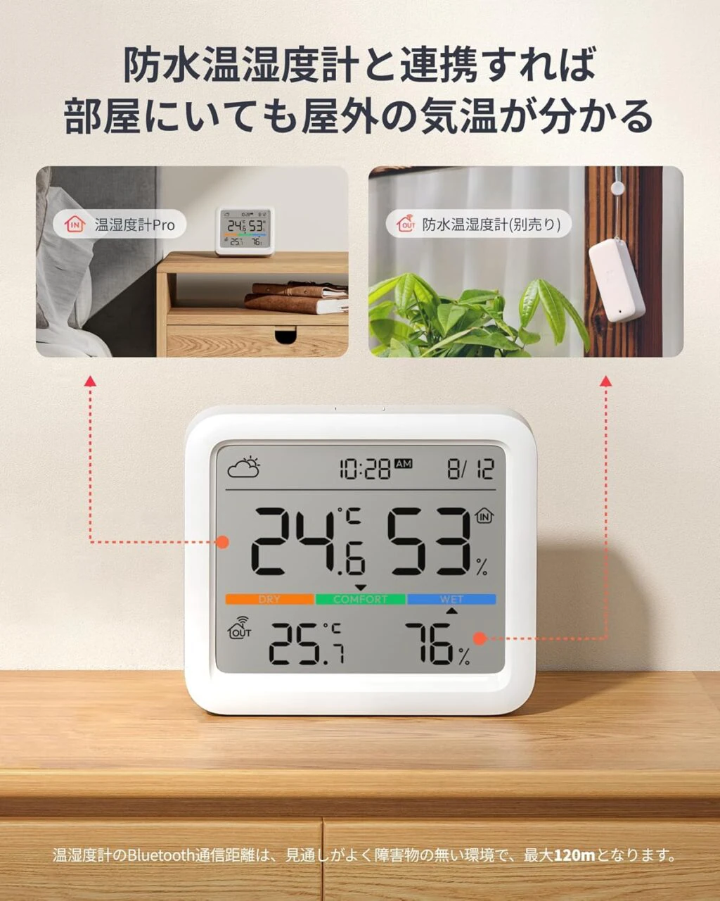 ▼別売りの「防水温湿度計」と連携することで、屋外の気温や湿度を高精度で測定可能。