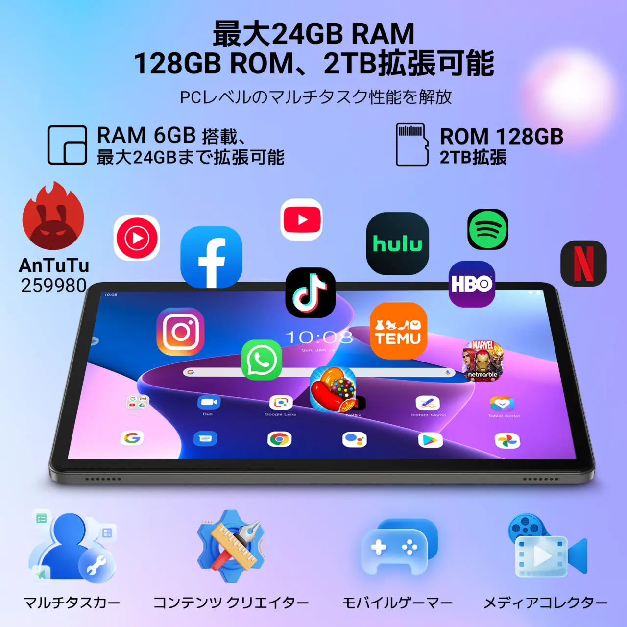 CPU(SoC)には「Unisoc T7250 オクタコアプロセッサー」を備え、RAMは24GB(実装6GB+仮想18GB)を採用。128GBのストレージに加えて最大2TBのmicroSD拡張に対応し、大量の動画や写真データも余裕で保存可能です。