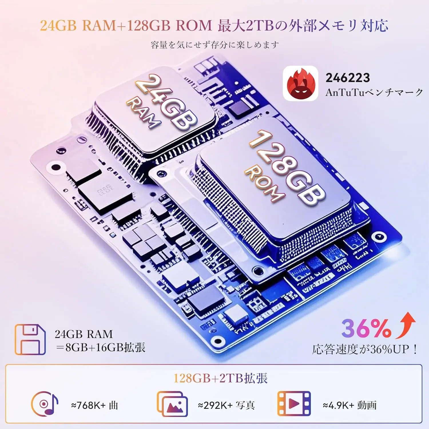 | RAM | 8GB (最大16GBの仮想RAM拡張サポート) |