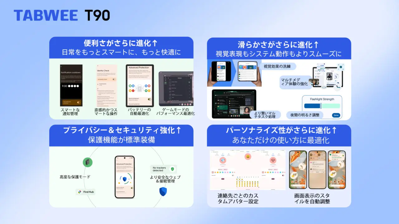 T90は、Android 16の「高度な保護モード(Advanced Protection Mode)」を完全にサポート。盗難防止機能、アプリ制限、暗号化通信、フィッシング対策ツールなどを備え、日常使いからビジネスまで安心して利用できる、高度なセキュリティ性能を提供します。
