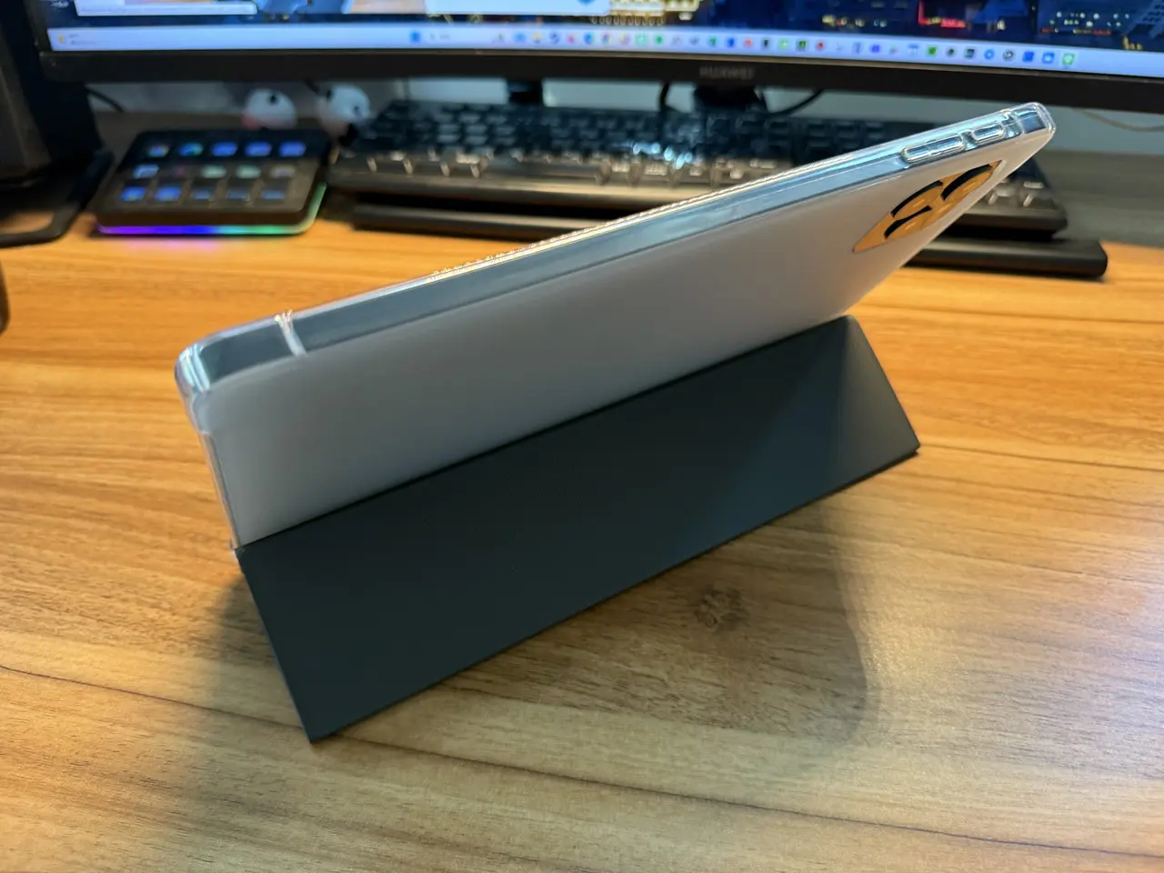 ▼スタンド背面を折り曲げることで、簡易的なタブレットスタンドとしても機能する。
