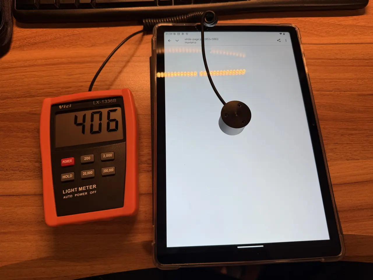 ちなみに、デジタルルクスメーター「Vici LX1336B」を使用して画面の明るさを計測したところ、最高406nitの明るさであった。