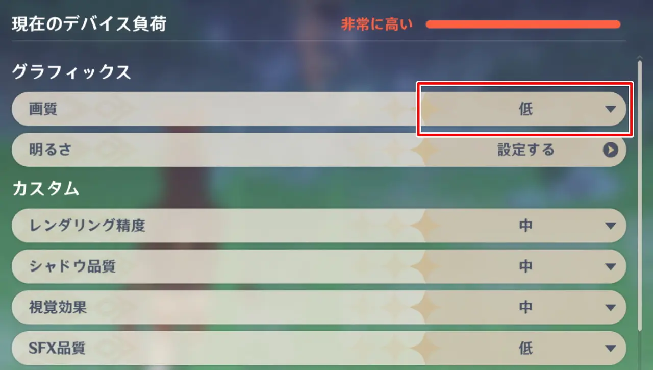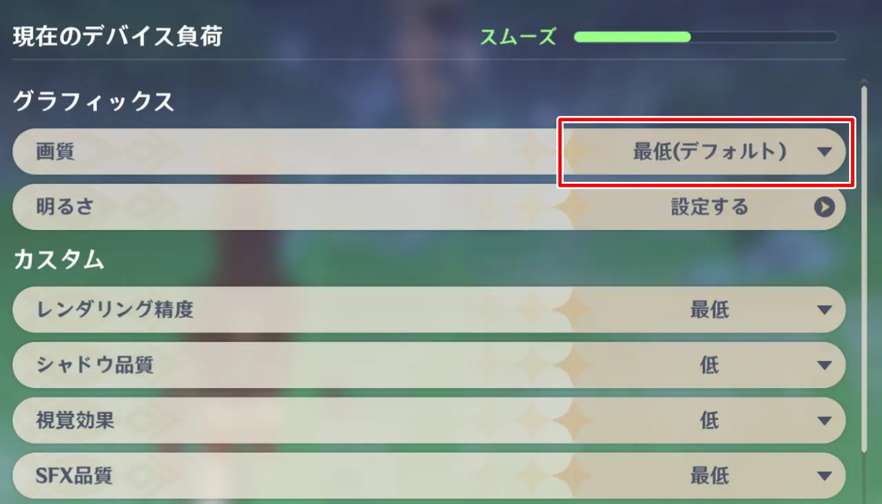 ▼"低" 画質設定に上げると、フレームレート低下が生じてカクつくようになる。