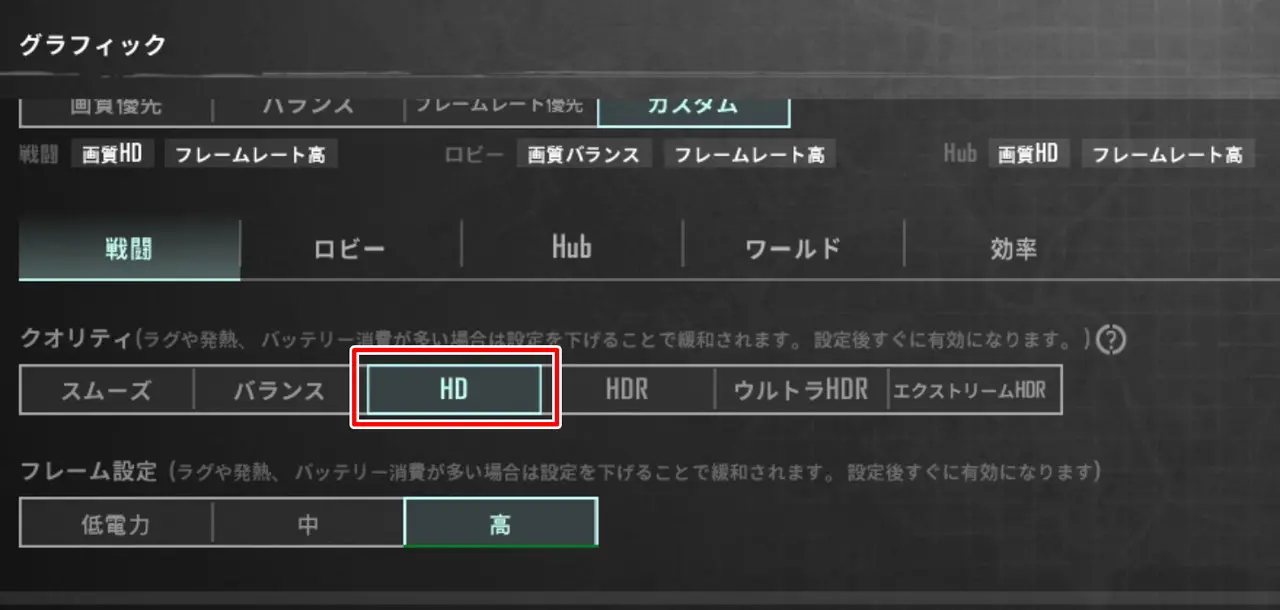 まずグラフィッククオリティに関しては『HD』まで選択できた。