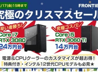 BTOパソコンやゲーミングPCの販売を手掛ける大手オンラインショップ『FRONTIER(フロンティア)』。 同サイトにおいて、人気の高いRTX3000台グラフィックボードを搭載したハイエンドゲーミングPCを、非常にお得な価格で購入出来る フロンティア 究極のクリスマスセールが開催されます。 特設サイト:フロンティア 究極のクリスマスセール 実施期間:~ 2021年12月17日(金)15:00まで 『RTX3080Ti』や『RTX3080』などを搭載したハイエンドゲーミングモデルだけでなく、『RTX3070 ...
