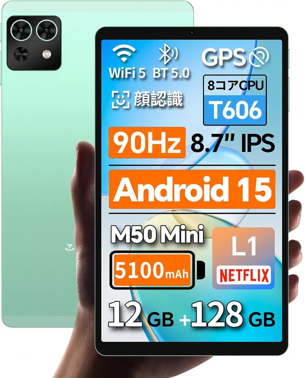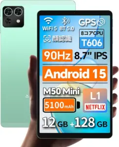 OSには最新Android 15を採用。1340×800解像度、90Hzリフレッシュレート対応の8.7インチディスプレイを搭載。CPU(SoC)には「Unisoc T606 オクタコアプロセッサー」を搭載するなど、こちらも比較的リーズナブルな価格に対して、実用的なスペック構成を備えたコンパクトモデルとなっています。