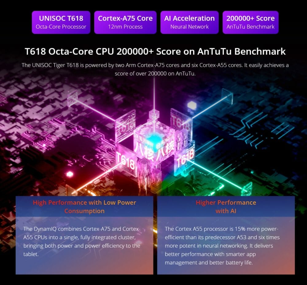 本機はCPUに『UNISOC Tiger T618』、メモリ(RAM)に6GBを搭載したことにより、ベンチマークスコアで20万点オーバーという、この価格帯のミドルスペック機としてはかなり高い性能を実現している。
