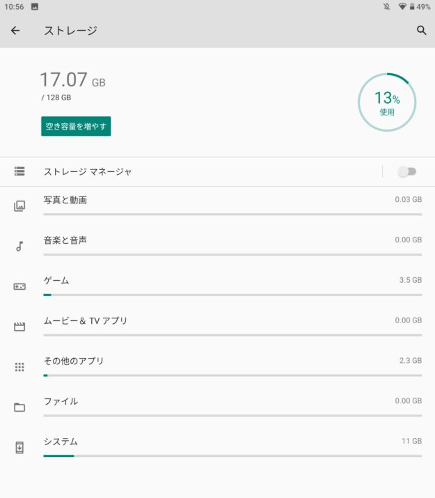 ちなみに本体ストレージはデフォルト状態で11GBをシステムに使用されており、実質的に利用できるのは117GB分となっている。