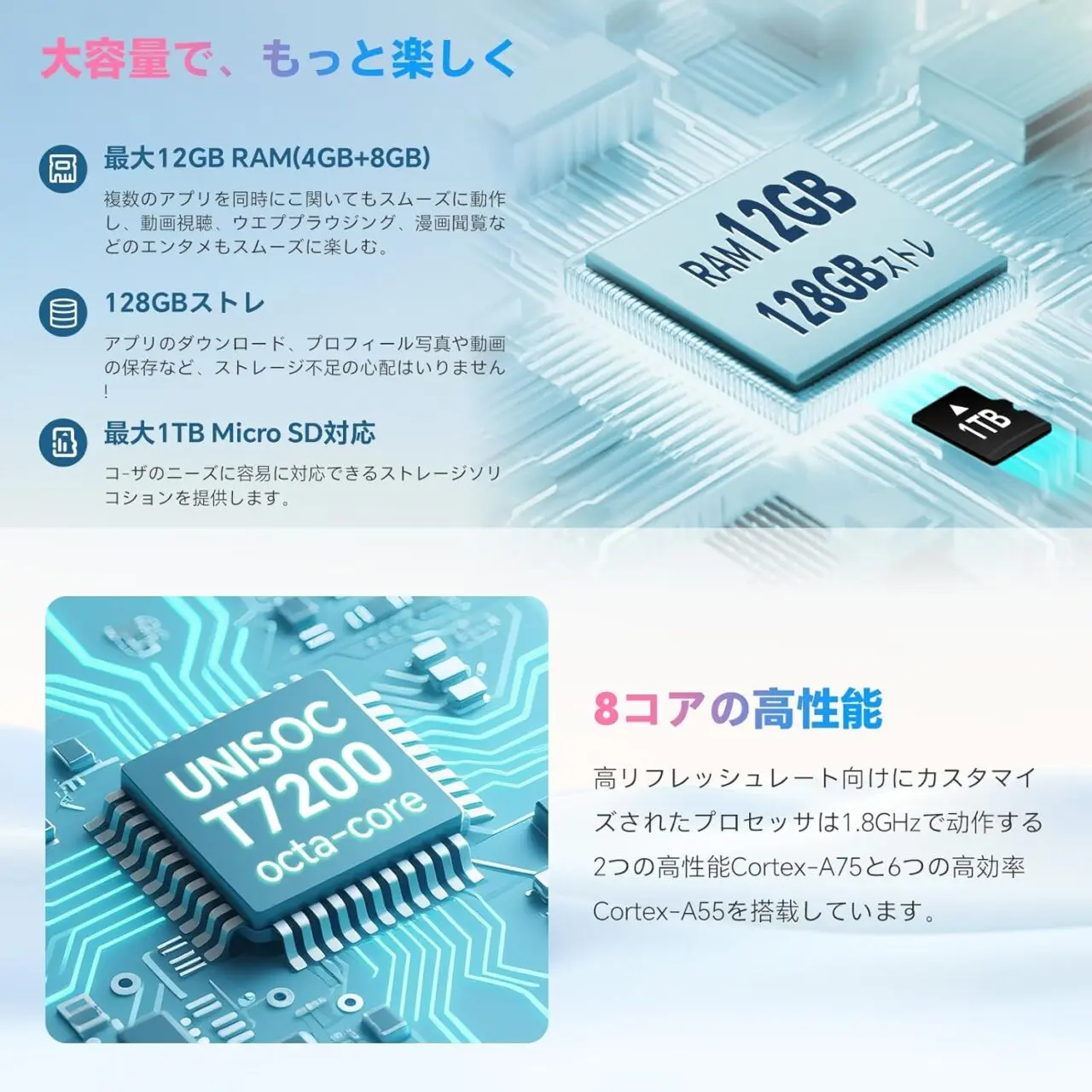 12GB RAM(拡張含む)+128GBストレージ(最大1TB拡張対応)、8コアSoC「Unisoc T7200」を採用し、日常作業から動画視聴まで快適にこなせます。