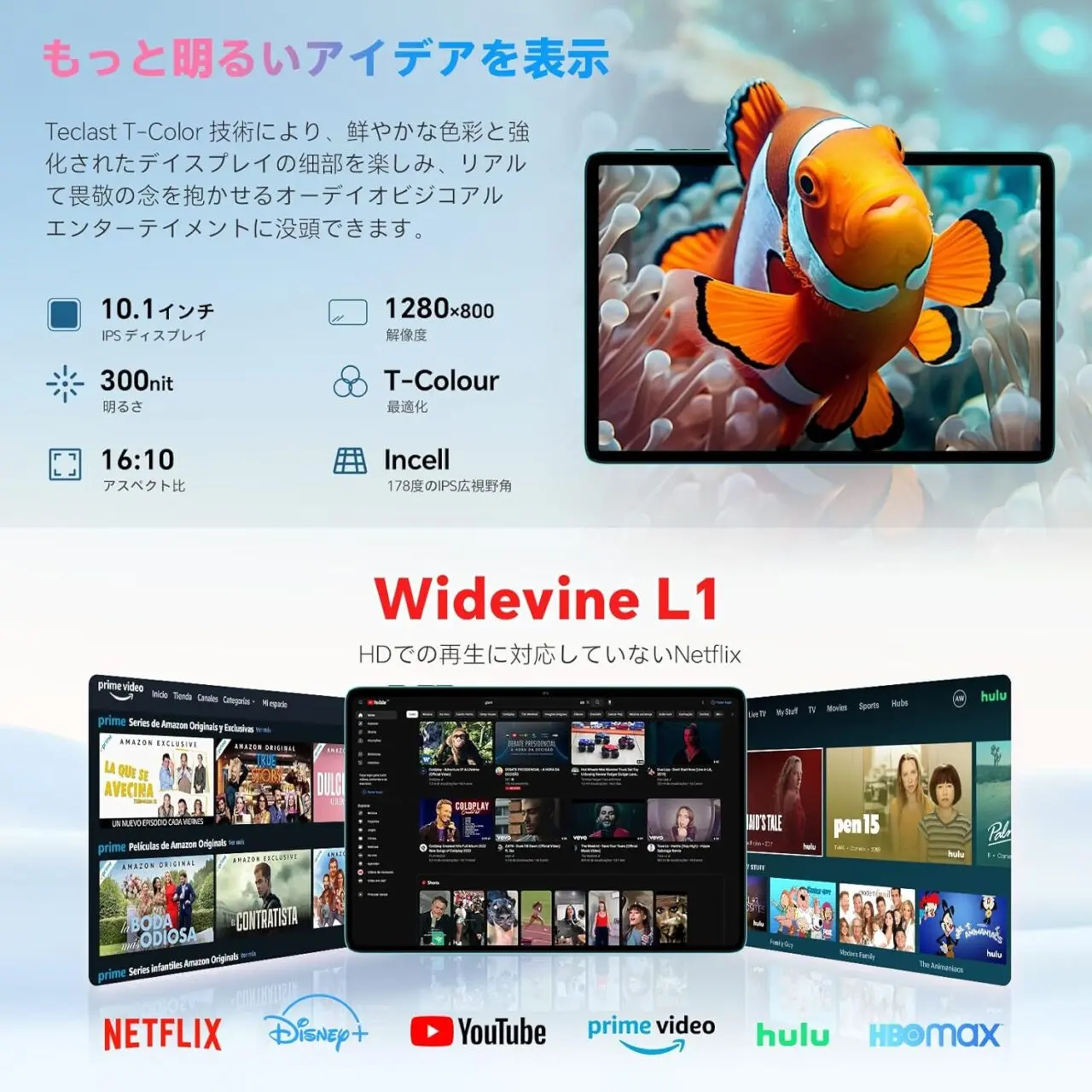 OSはAndroid 16を搭載。1280×800(HD+)解像度に対応、Widevine L1サポートとなっており、HuluやAmazon Primeビデオ、ネットフリックスなどの配信サービスにおいて高画質設定の映像を楽しめます。