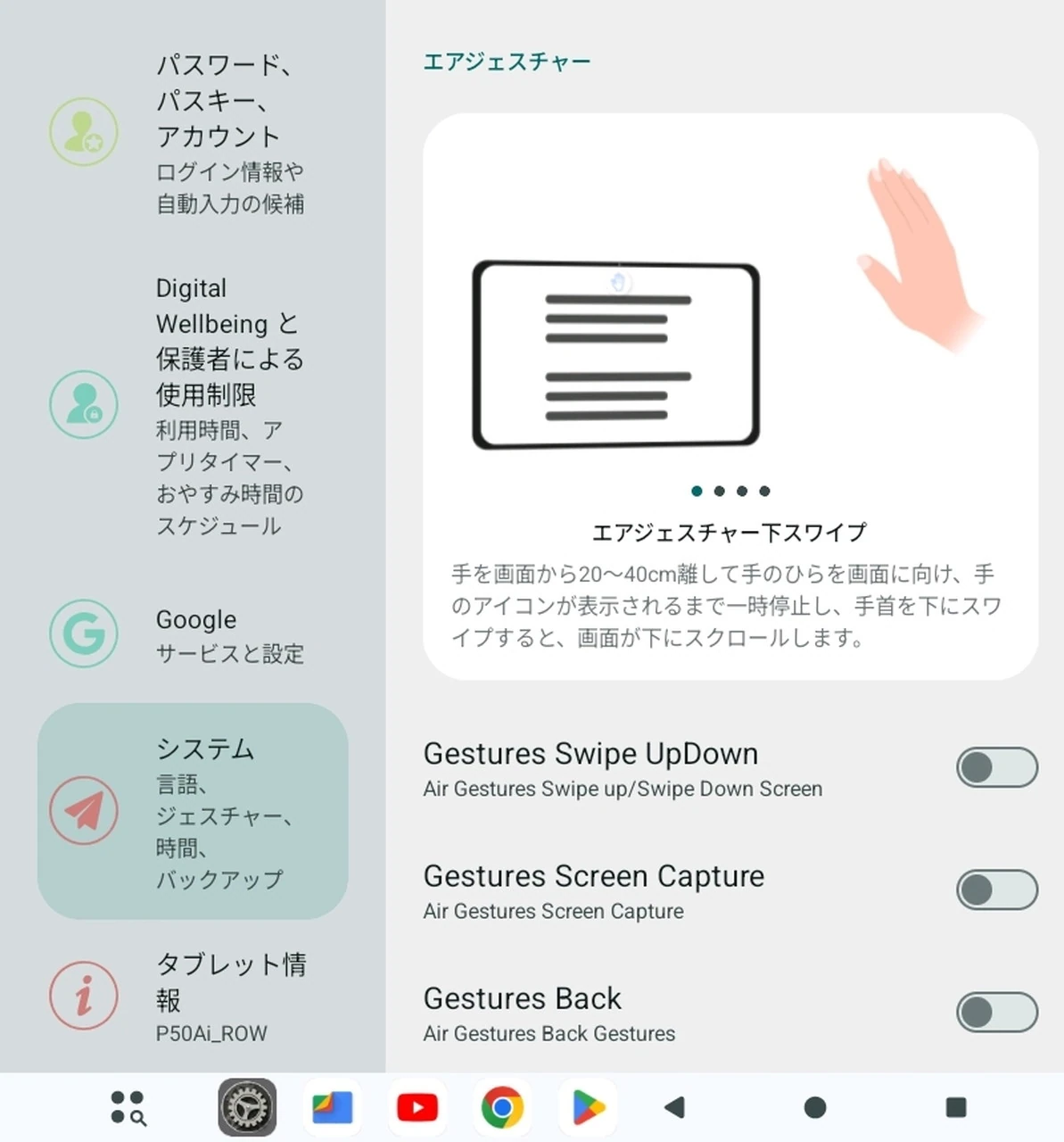 設定から「エアジェスチャー」をオンにすることで、タブレット画面に手のひらを向けて、手首を上下にスワイプしたり、裏返したり、握ったりすることで、画面スクロールやスクリーンショット撮影などを機能を利用できる。