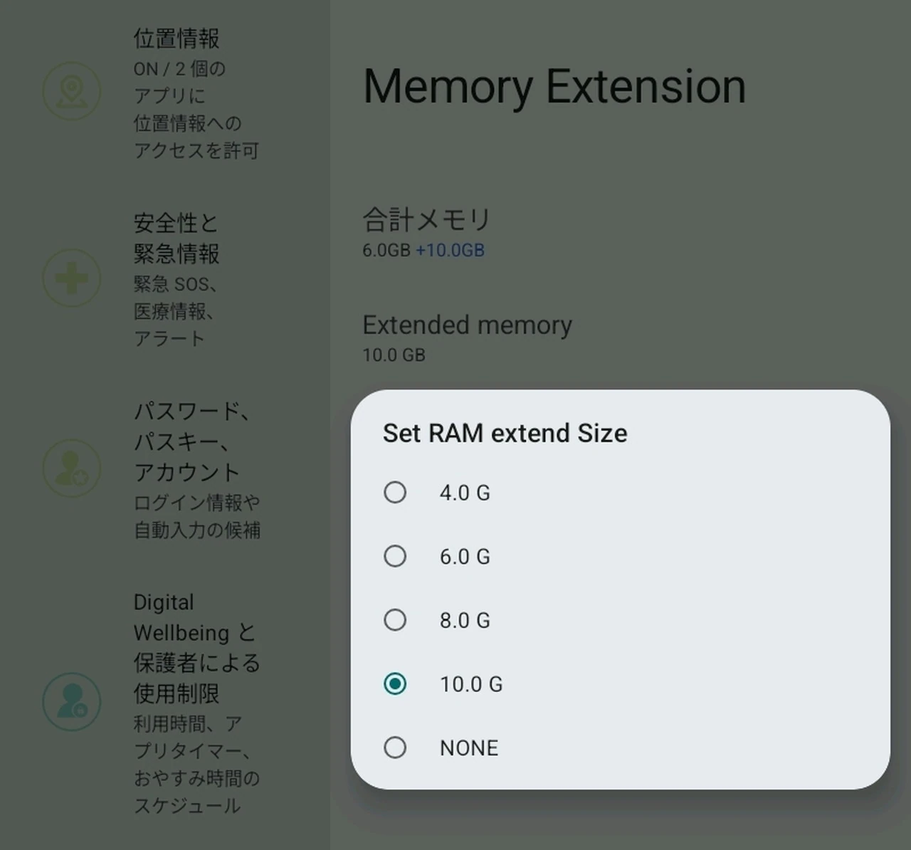 なお、設定より最大10GBの仮想RAM拡張が可能だ。
