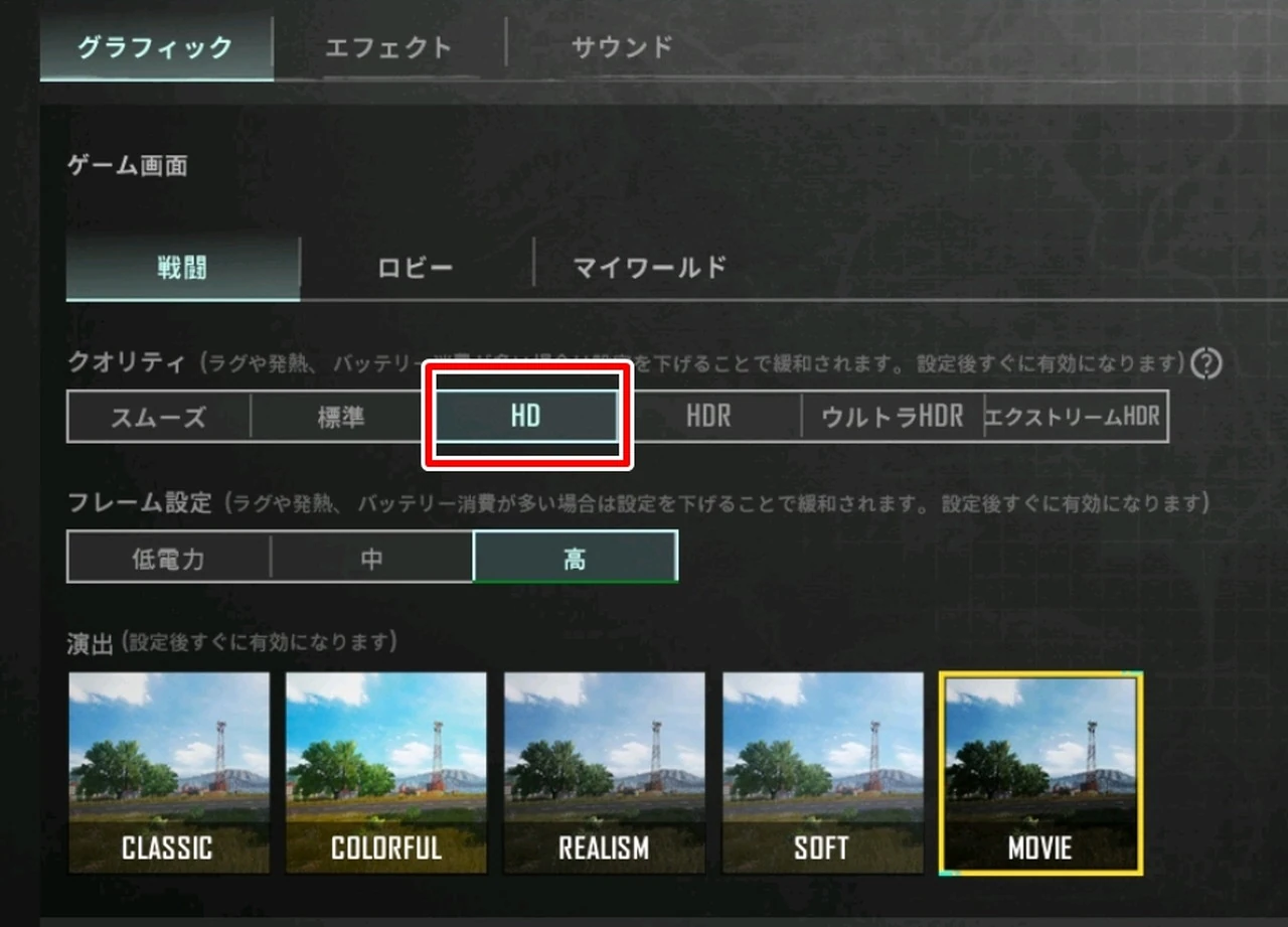 まずグラフィッククオリティに関しては『HD』まで選択できた。