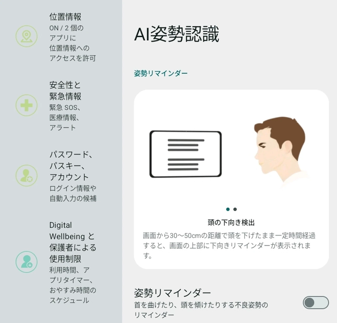 「AI姿勢認識」は、タブレット使用時のユーザーの姿勢を正すための機能だ。