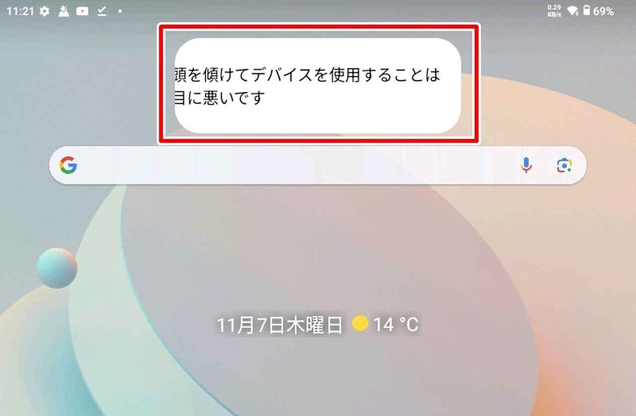 この機能をオンにすると、頭を下げ、首に負担のかかる姿勢のままタブレットを使用している場合に、画面上部に警告が表示されるようになる。