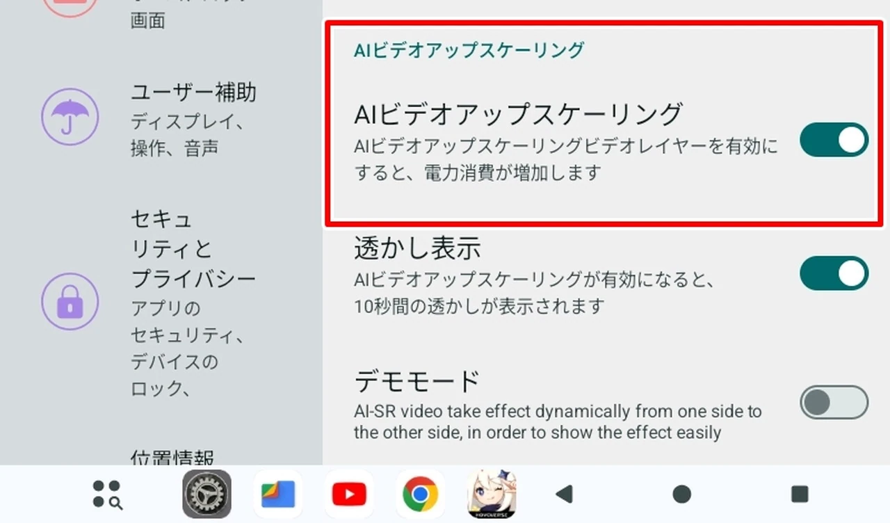 この機能をオンにすると、540pのビデオ解像度は1080pで出力でき、720pのビデオ解像度は1440pで出力されるようになる。Teclast公式によると、トム&ジェリーやドラえもんなど、特に昔のアニメ動画において高い効果を発揮するとのこと。