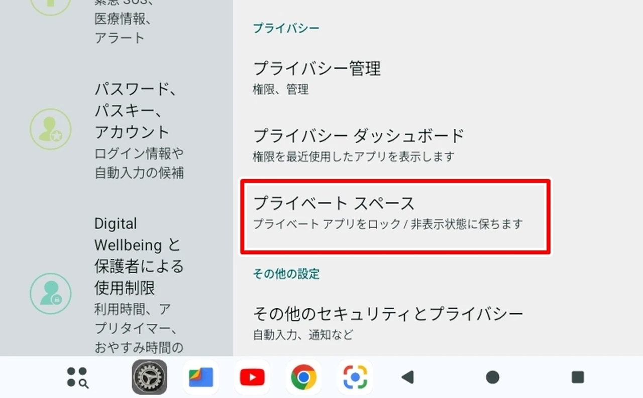 「プライベートスペース」とは、公開したくないアプリやファイルを、パスワード入力後のみ表示されるプライベートスペースに保存できる機能だ。