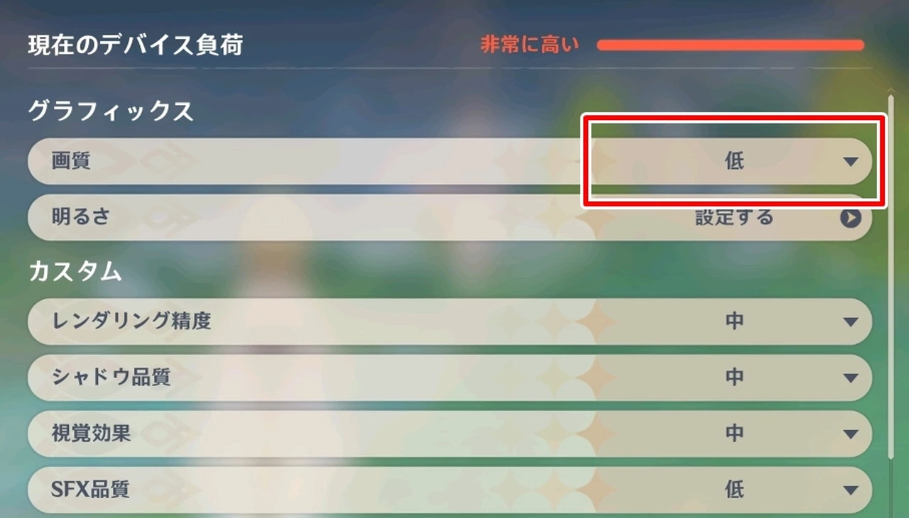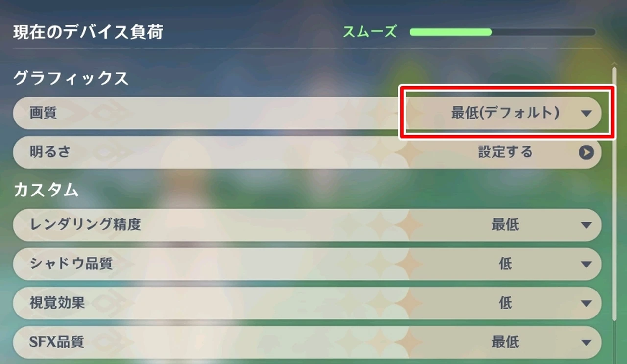 ▼画質設定はデフォルト状態で "最低" に設定されており、デバイス負荷は "スムーズ" の状態。