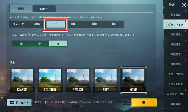 まずグラフィッククオリティに関しては『HD』までを選択することが出来た。