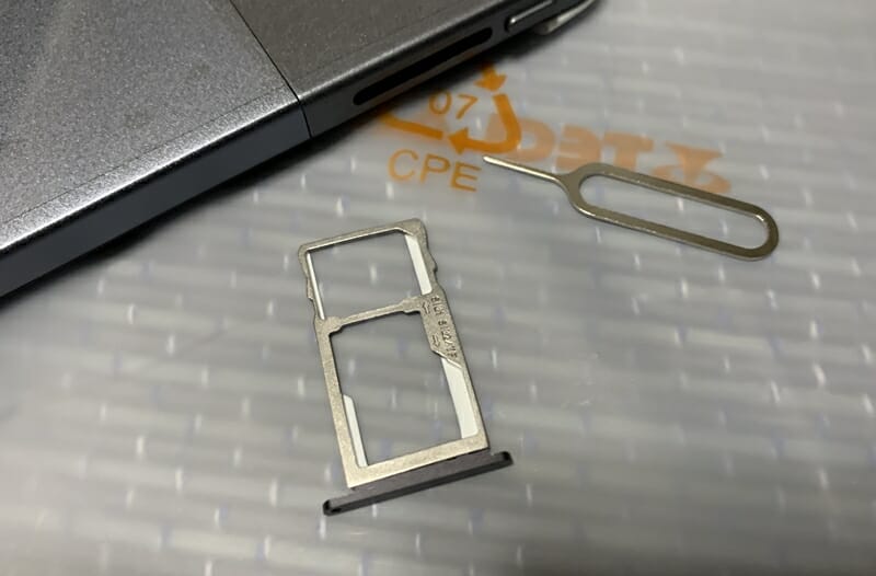 ▼付属のピンを用いることでカードスロットを開き、SIMカードやマイクロSDカード(最大512GBまで)を装着することができる。