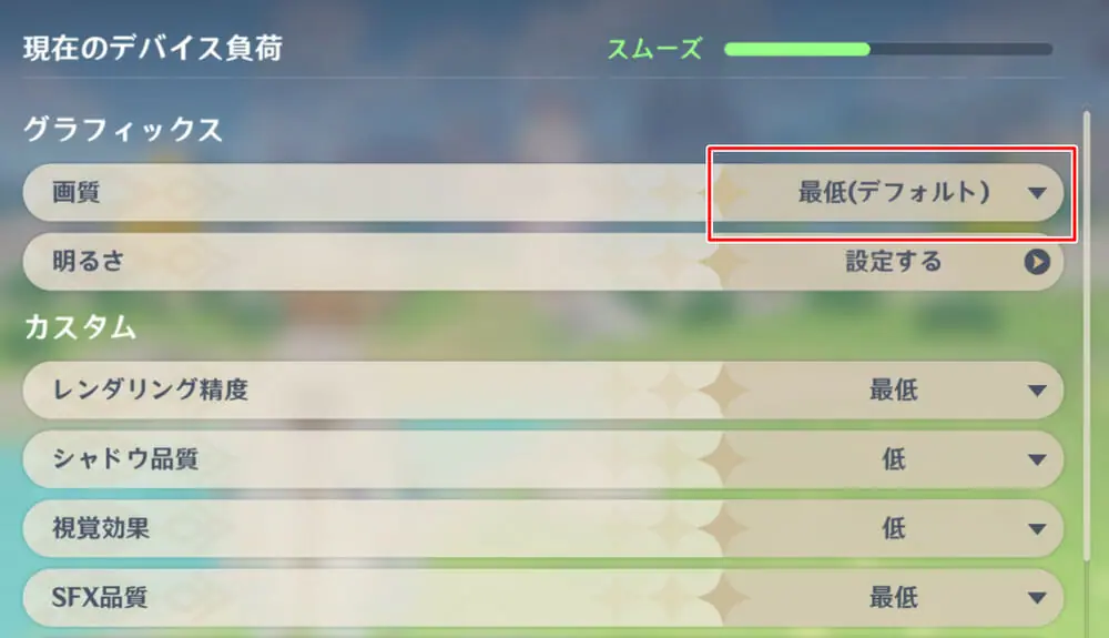 ▼画質設定はデフォルト状態で "最低" に設定されており、デバイス負荷は "スムーズ" の状態。