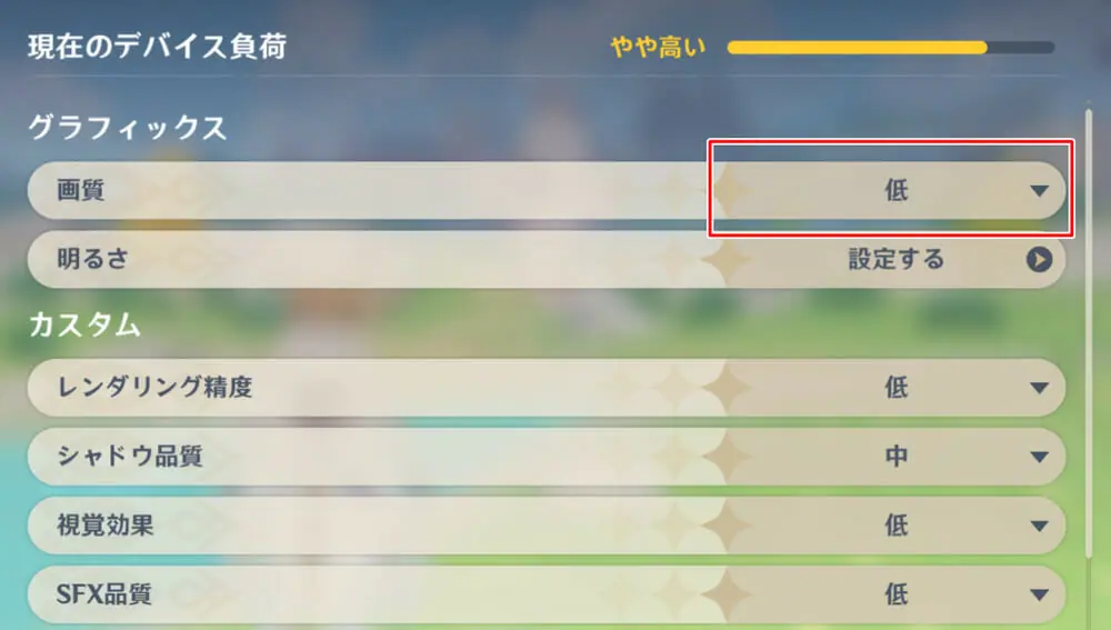 ▼画質設定を "低" に設定した場合、デバイス負荷は "やや高い" となり、プレイ中にカクつきやフレームレート低下が目立つようになる。