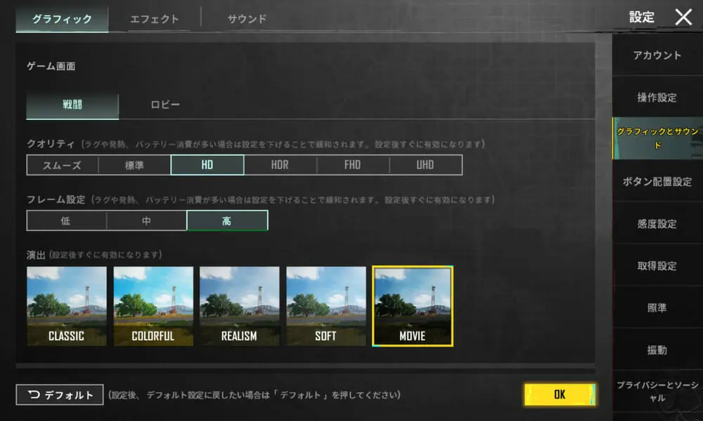 まずグラフィッククオリティに関しては『HD』まで選択できた。