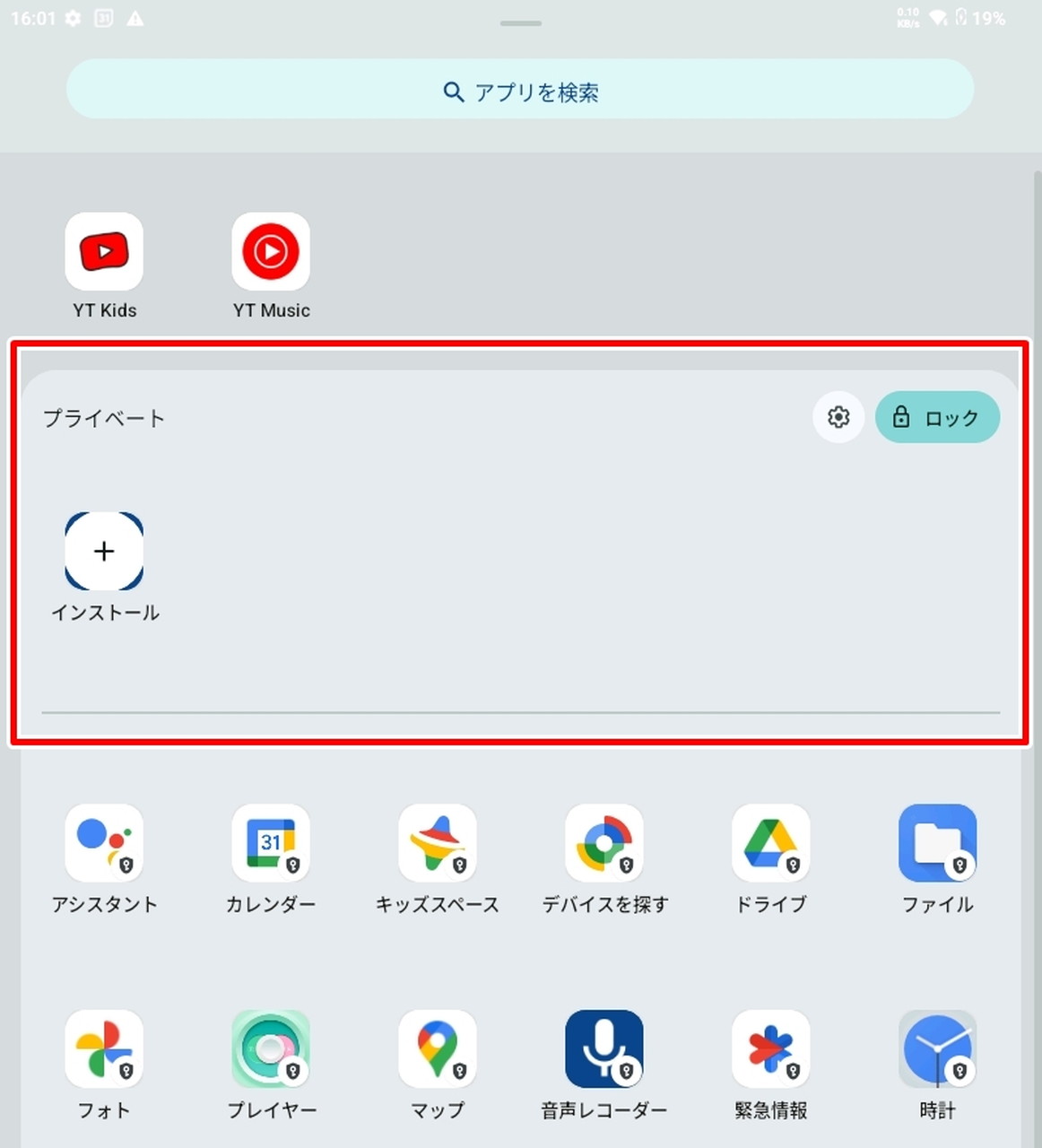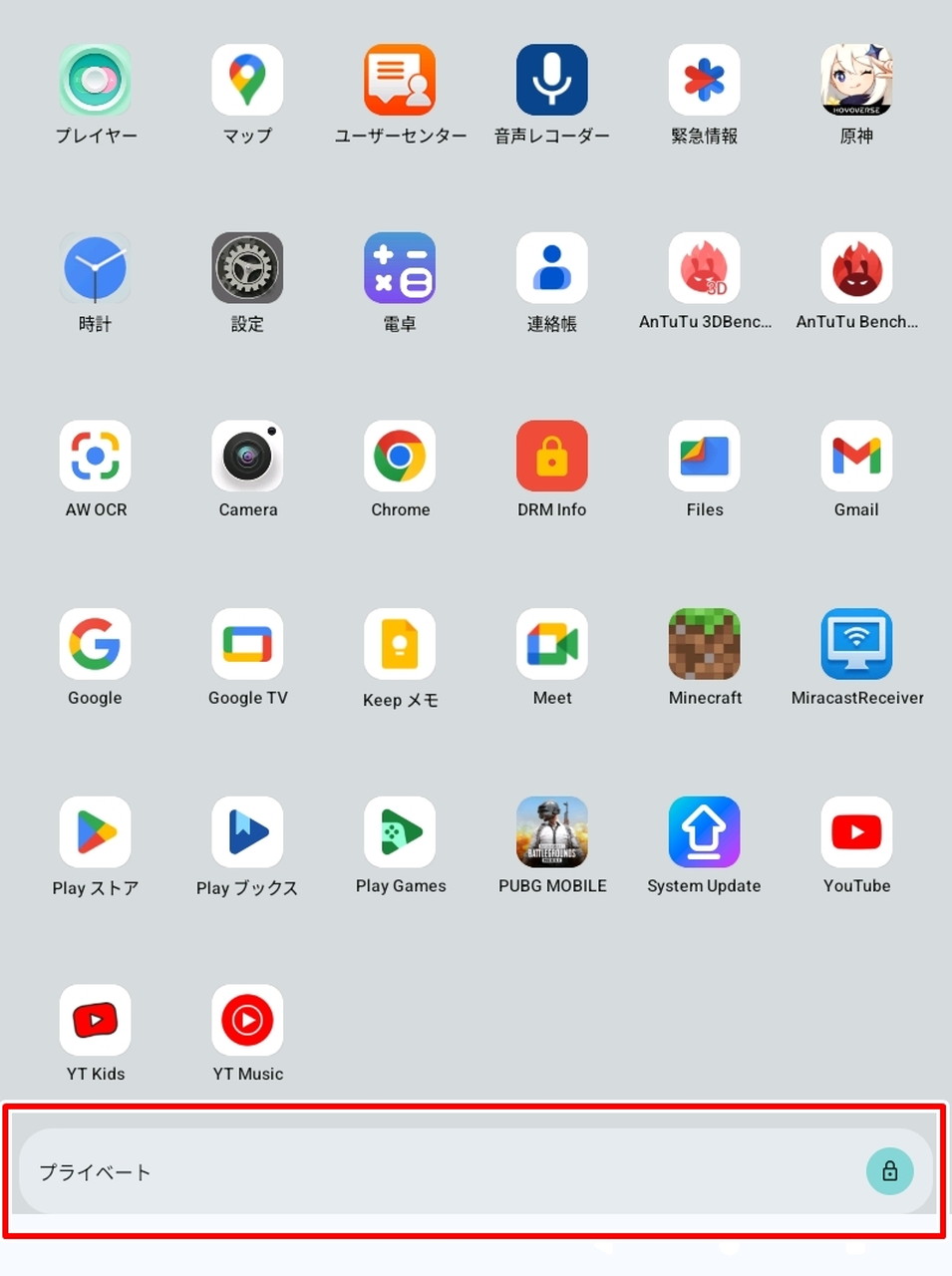 ▼プライベートスペース機能をオンにすると、アプリ一覧画面の下部にロックアイコンが表示されるようになる。